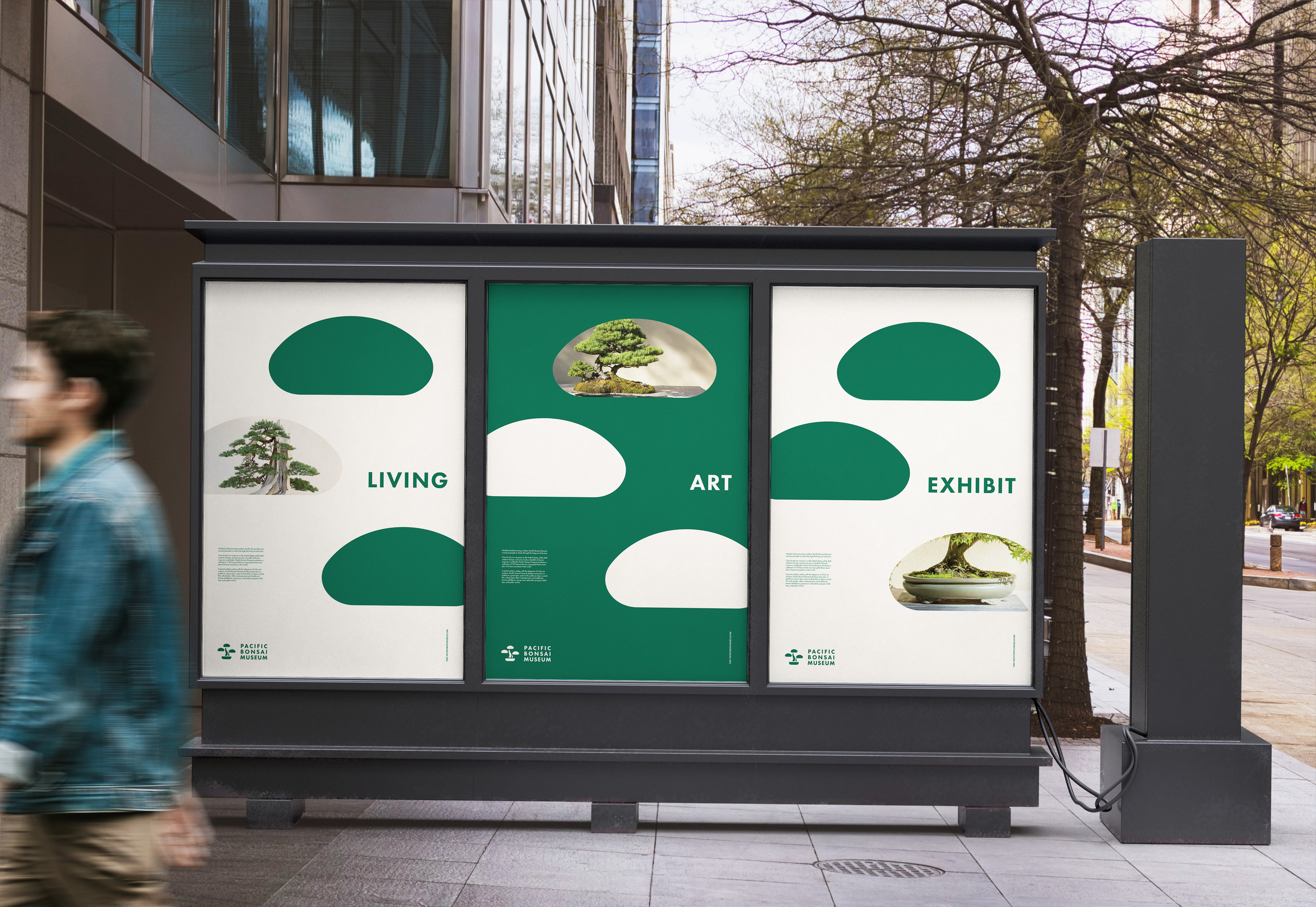 This is a rebrand of the Pacific Bonsai Museum. The proposed new logo is a pictorial mark of a bonsai tree with uniquely shaped leaf pads and organic curves. This pictorial mark indicates the visual beauty and natural forms of the many bonsai tree exhibits on display at the museum. The organic curves of the logo are used throughout all brand assets for brand cohesion and identity. All paper used for brand assets are recycled material with a matte texture to further emphasize the connection with the environment.